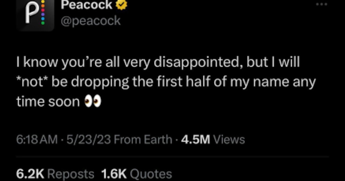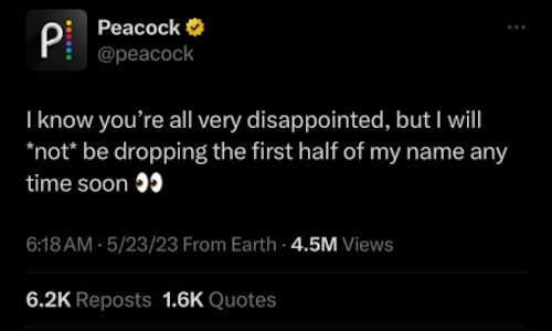 @Peacock’s persona is rooted in our master brand attributes and positioning, but just like you’d talk to your grandmother differently than you would talk to your boss or to your best friend or to your partner, @Peacock flexes its style and tone per platform to converse authentically with the core audience we’re seeking to reach