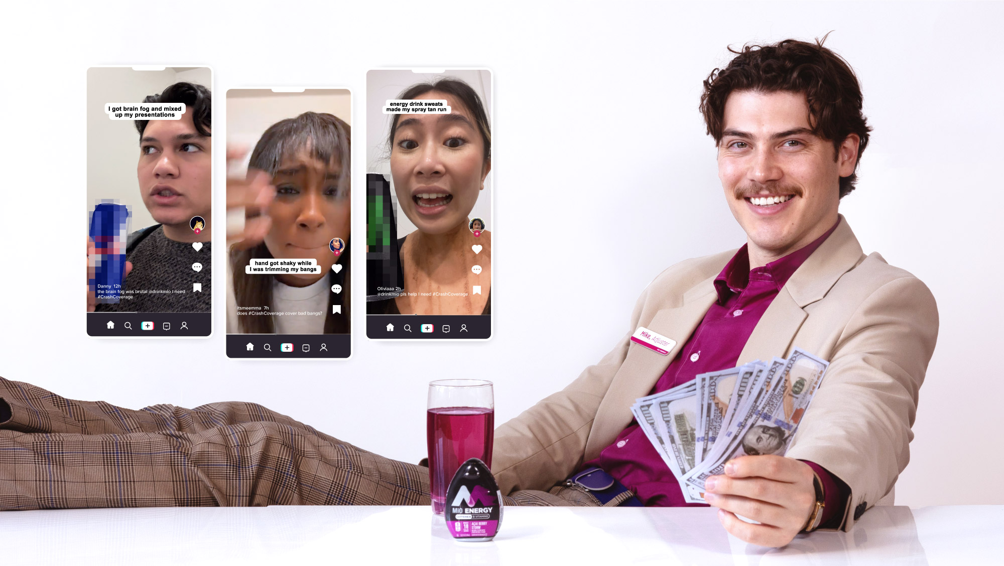 We received hundreds of unique entries through TikTok and directly on our Crash Coverage website. We couldn’t mention our competitors by name but that didn’t stop participants from doing it. They called out the world's biggest energy drink brands, drowsiness, the shakes, sweaty pits, nervous sh!#$; you name it, they claimed it. Jack stitched the most entertaining ones on TikTok, awarding various amounts of money depending on the "damages." We also gave the entrants MiO Energy, to ensure they never crash again.