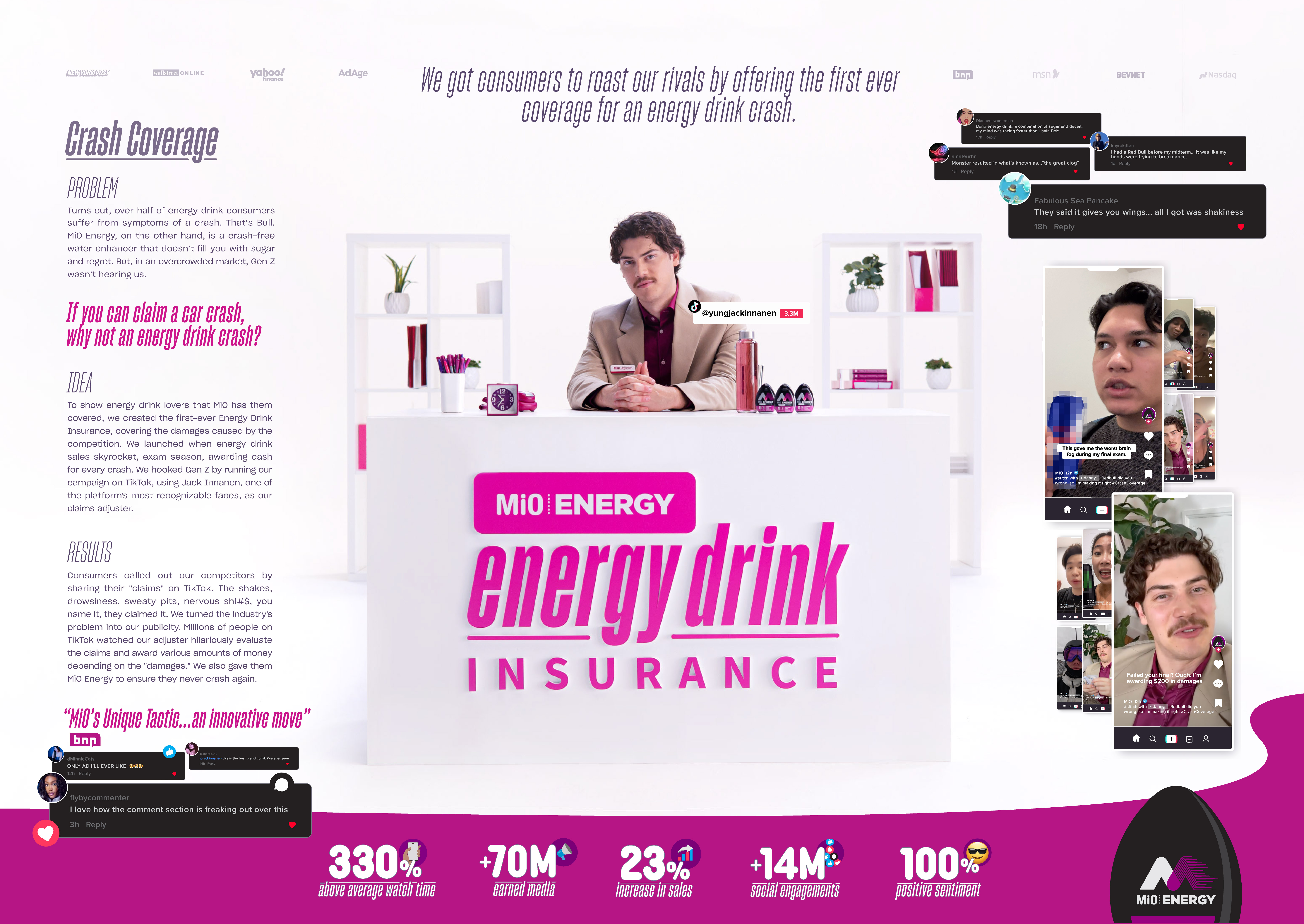To show energy drink lovers that MiO has them covered, we created the world's first Energy Drink Insurance, covering the damages caused by the competition. For the first time ever, people could claim an energy drink crash. We made claiming easy; share a video or write-up describing a bad experience from an energy drink. By offering Crash Coverage, we got energy drink fans to roast our rivals for us, while positioning MiO as the energy drink alternative that doesn't leave you feeling awful.