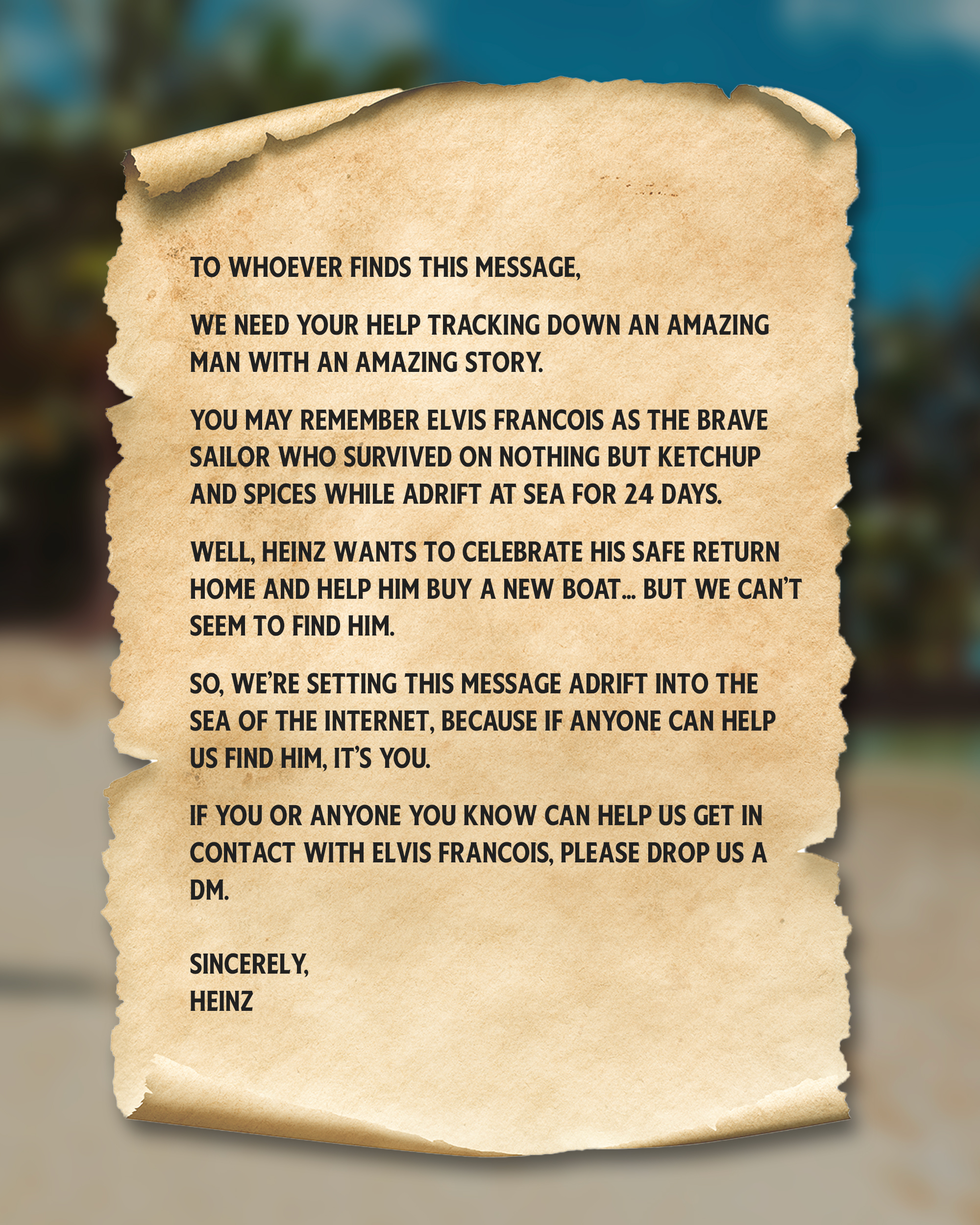 A happy ending to Elvis Francois’ incredible story, only made possible because the world worked together to help Heinz #FindTheKetchupBoatGuy. Our message in a bottle resulted in thousands of messages, shares, likes, and headlines on six continents.