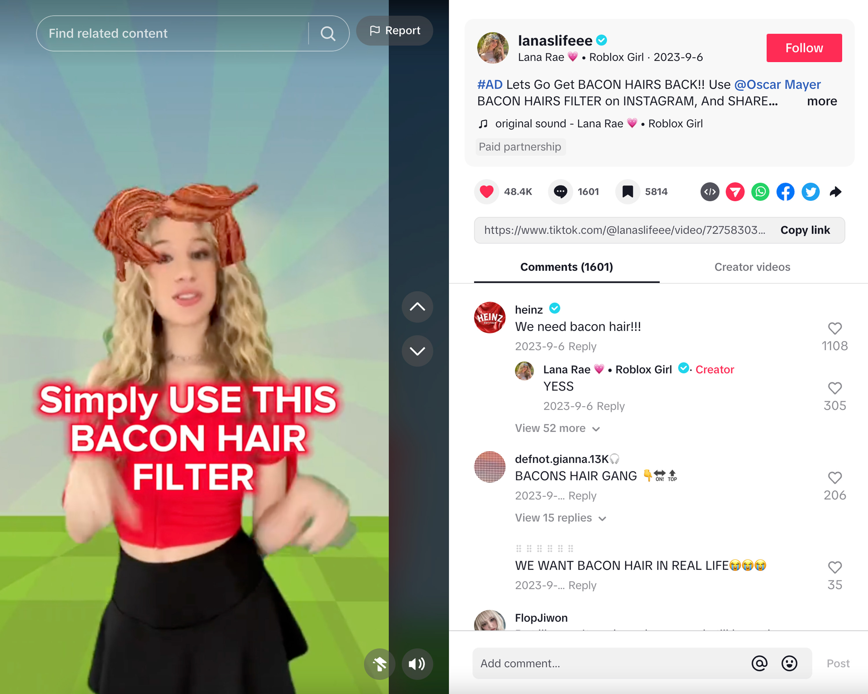 We kicked the campaign off by creating a Bacon Hairs Instagram filter — our own virtual version of Roblox’s Pal Hair — which fans could use to show their support on social. We partnered with one of the biggest Roblox influencers, Lana Rae. A bacon-hair supporter with 8+ million followers across TikTok, YouTube and Instagram, Lana helped galvanize gamers for our wonderfully-odd cause and helped launch the filter. With 80,200 filter uses, our movement gained traction — but Roblox was yet to respond. So we explored new ways to gain support.