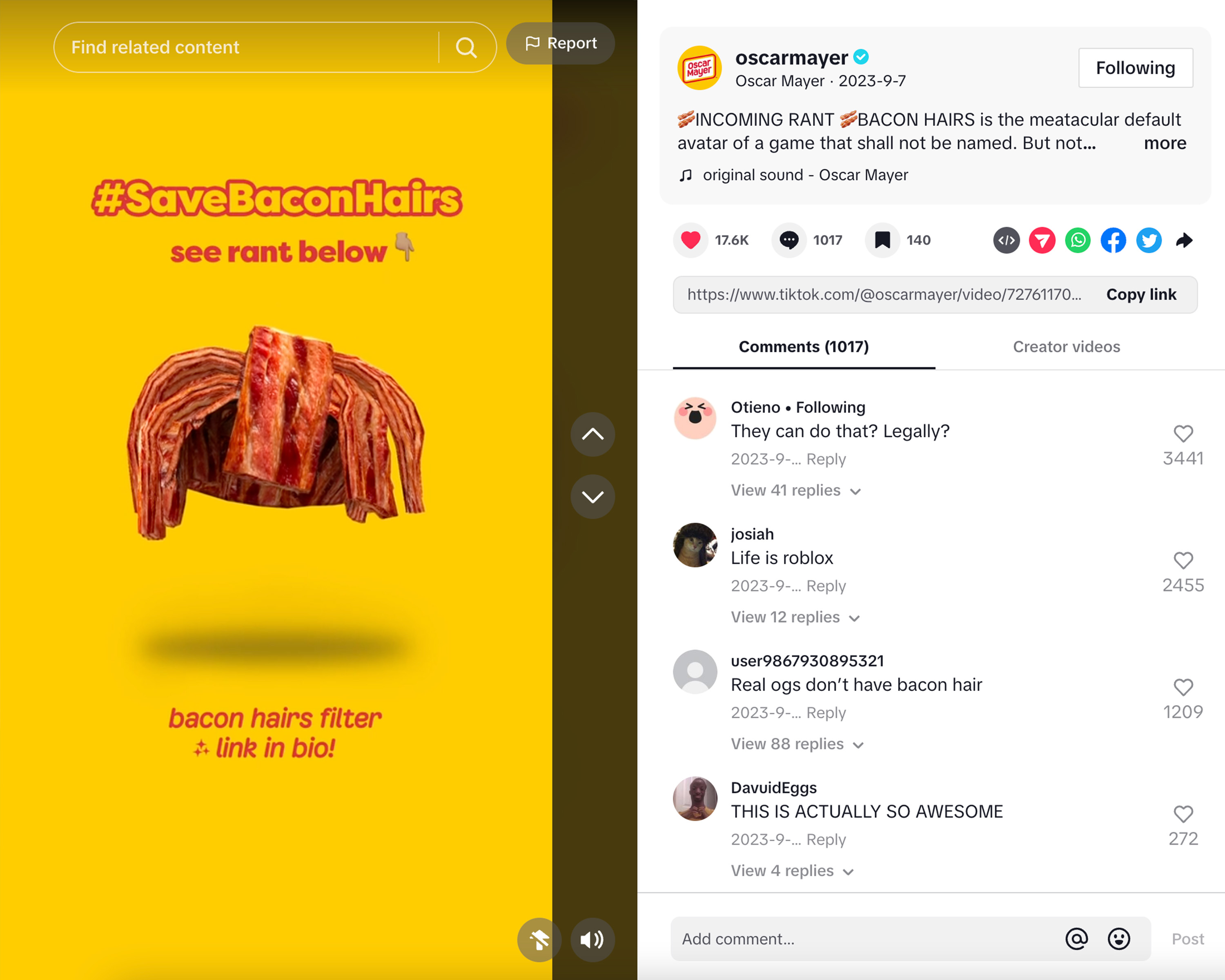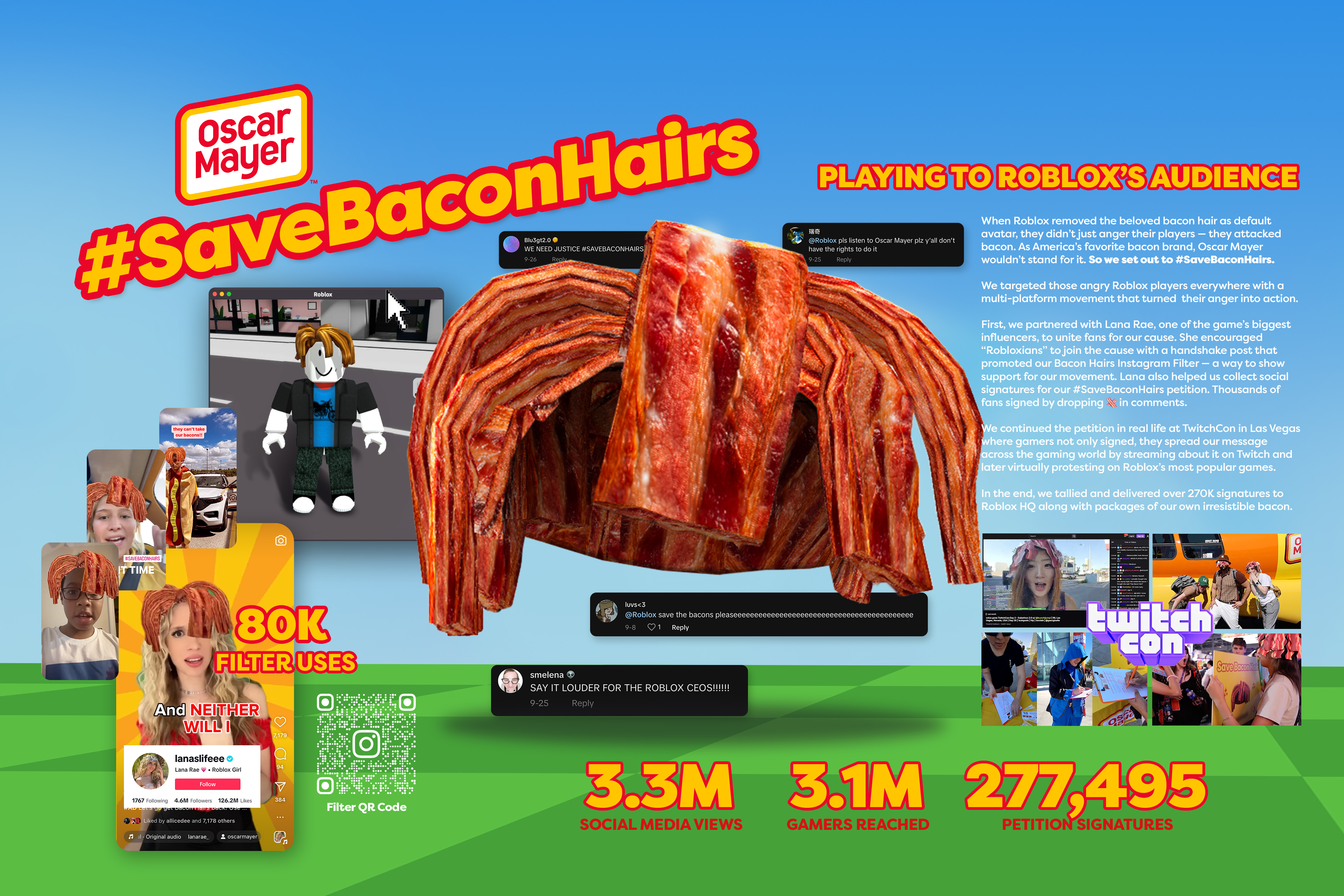 The #SaveBaconHairs campaign was a reactive reaction to a moment in gaming culture which we identified using social listening that had a natural connection to one of Oscar Mayer’s product lines — bacon! It also aligned with the brand’s goal to make its purpose to spark smiles more resonant with a new generation by disrupting the everyday with simply joyful escapes rooted in today’s culture.