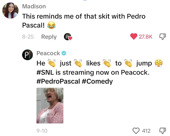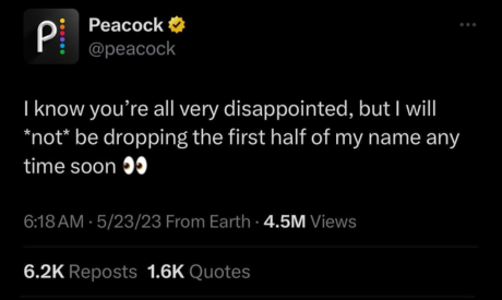 @Peacock’s persona is rooted in our master brand attributes and positioning, but just like you’d talk to your grandmother differently than you would talk to your boss or to your best friend or to your partner, @Peacock flexes its style and tone per platform to converse authentically with the core audience we’re seeking to reach