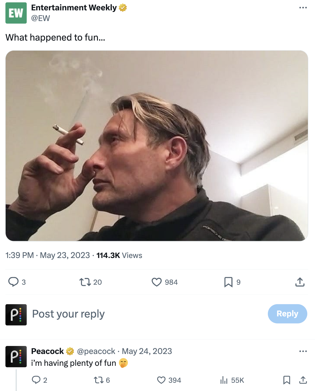 @Peacock showed up and showed out in 2023, with a triple digit improvement in cross-platform organic engagement YoY (+264% from 27.5M to 100M). TikTok and Instagram, where we hyperfocused on scaling our community management and fan engagement practices, contributed 81% of that 100M total.